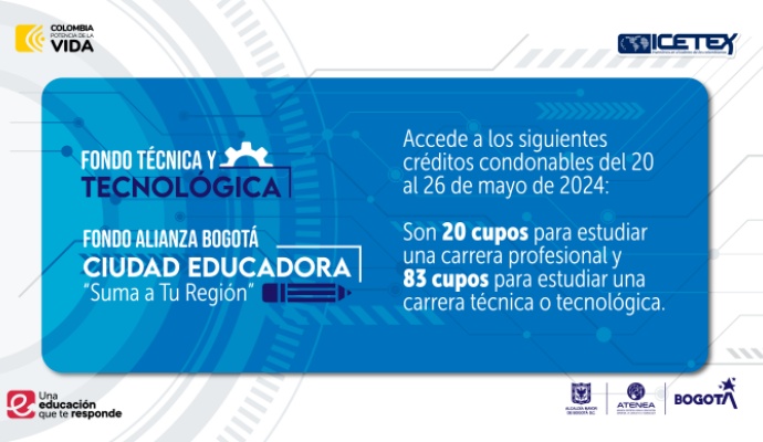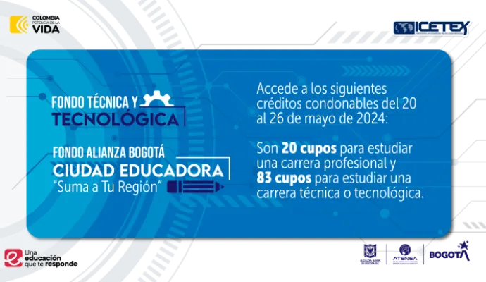 Bogotá D.C., mayo 20 de 2024. Con el propósito de facilitar el acceso a la educación posmedia a la población más vulnerable de la capital, la Agencia Atenea, a través del ICETEX, abrió dos convocatorias para otorgar 103 créditos condonables. Estos créditos se dividen en 20 cupos para financiar carreras profesionales universitarias mediante el Fondo Alianza Bogotá Ciudad Educadora “Suma a Tu Región”; y el Fondo Atenea Técnica y Tecnológica brinda 83 cupos para financiar carreras técnicas o tecnológicas. Las dos convocatorias estarán abiertas del 20 al 26 de mayo de 2024 y las personas podrán inscribirse a través de: https://solicitudes.icetex.gov.co/solicitudes/ingres.sm